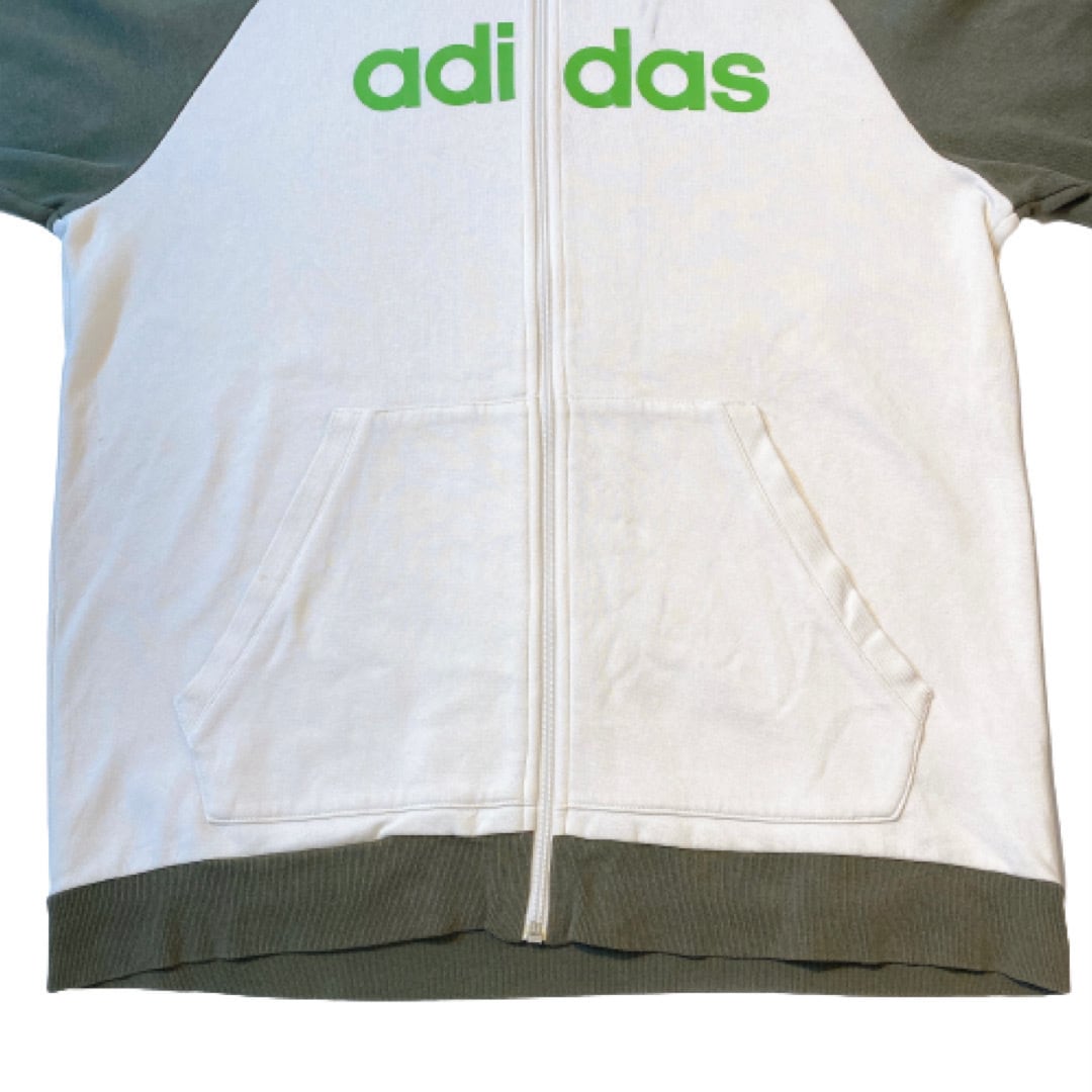 【アディダス ライン付き 薄手 パーカー オフホワイト カーキ 裏地 グリーン L 古着 adidas】